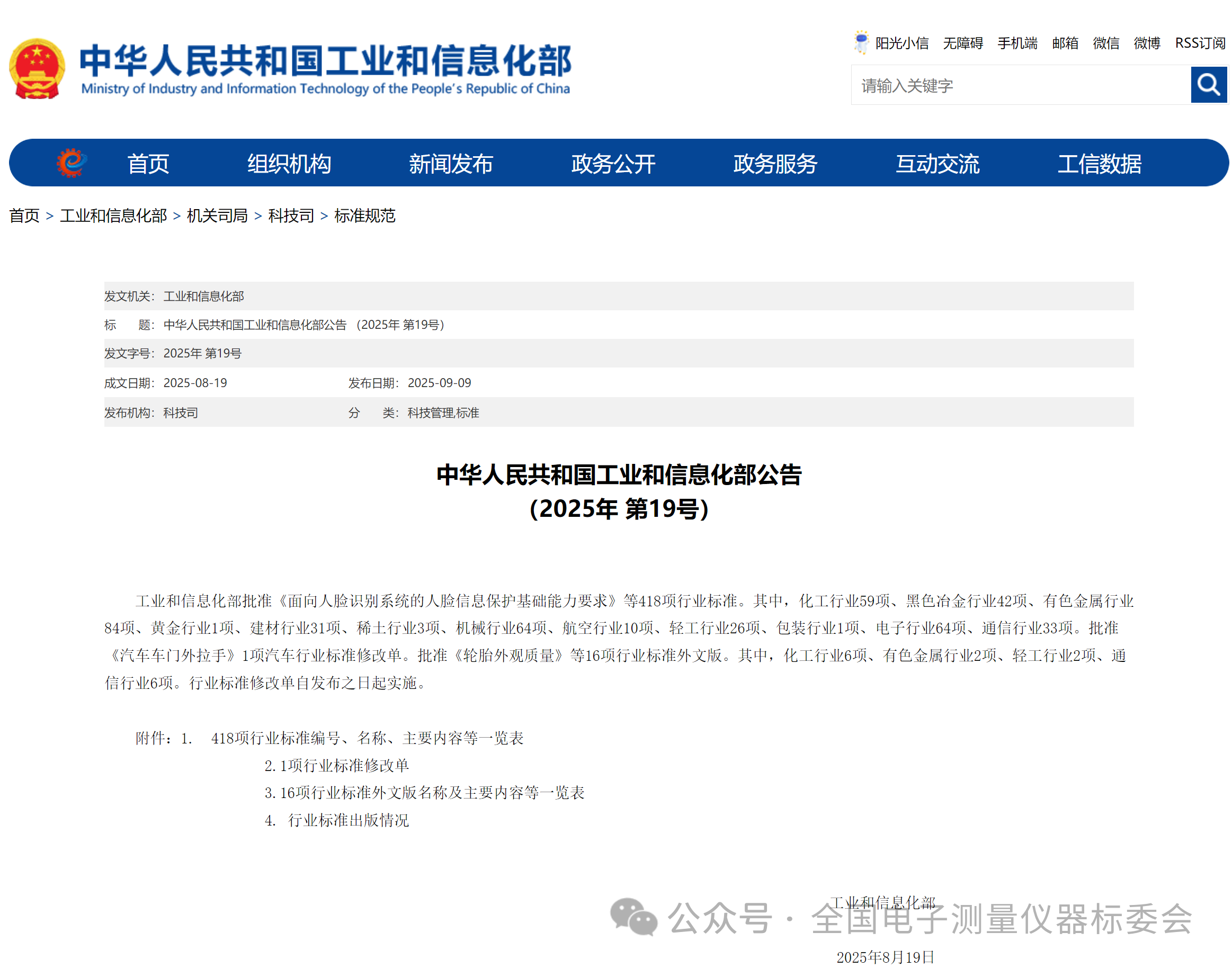 根據(jù)中華人民共和國工業(yè)和信息化部公告(2025年 第19號(hào)),由全國電子測(cè)量儀器標(biāo)準(zhǔn)化技術(shù)委員會(huì)歸口的《鋰電池芯短路測(cè)試儀》(標(biāo)準(zhǔn)號(hào):SJ/T 10230-2025)《電子紅外額溫計(jì)通用規(guī)范》(標(biāo)準(zhǔn)號(hào):SJ/T 10231-2025)等2項(xiàng)電子行業(yè)標(biāo)準(zhǔn)正式發(fā)布。